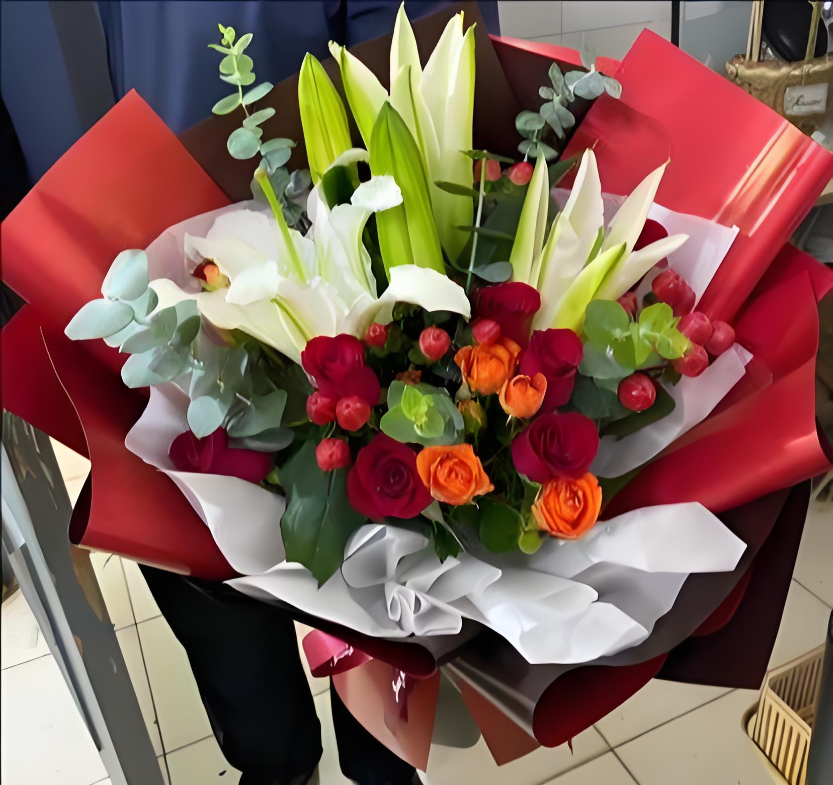 德州平原县花店包11枝红玫瑰、2枝多头白百合、6枝橙色多头玫瑰、红豆、尤加利叶